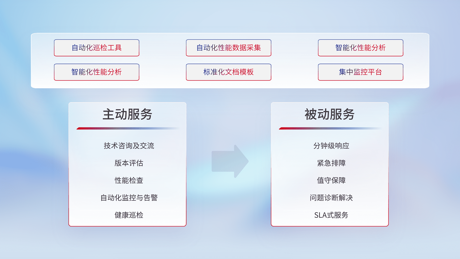 智能化工具和标准化文档,,,,保障服务质量,,提供主动服务(包含技术咨询、、、、版本评估、、性能检查、、、自动化监控与告警、、、、健康巡检)和被动服务包含(分钟级响应、、、紧急排障、、、、值守保障、、、问题诊断解决、、SLA服务)。。。
