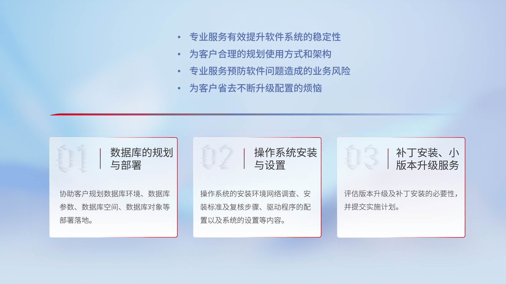 为客户提供软件规模升级、、、、快速部署、、、按需配置的专业服务,,,从数据库的规划与部署到操作系统的安装与设置,,再到补丁安装和小版本升级提供支持。。。