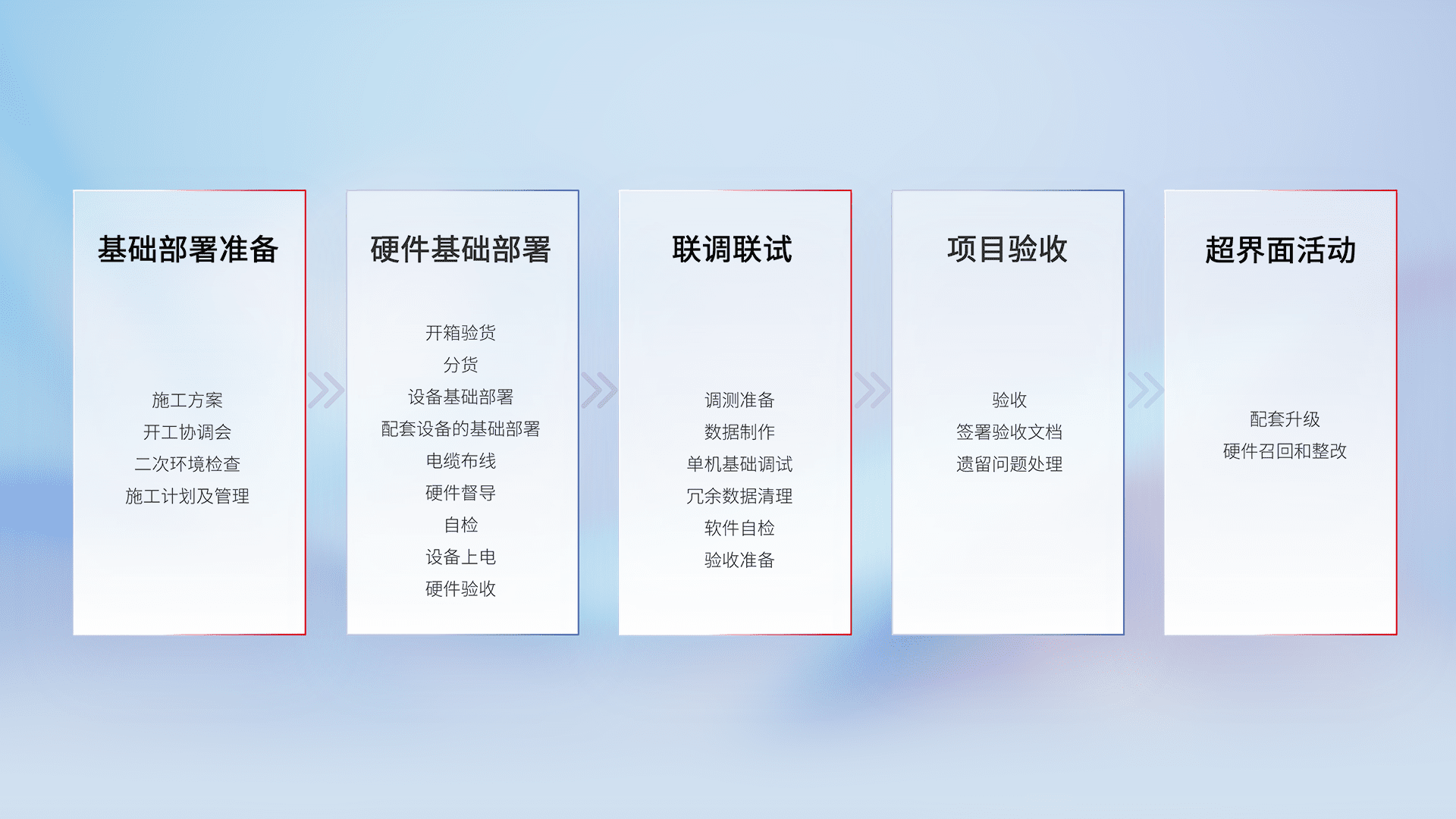从基础部署准备、、、、硬件基础部署、、、、联调联试、、、项目验收、、、、越界面活动的全过程可追溯,,保证施工质量和进度。。。。